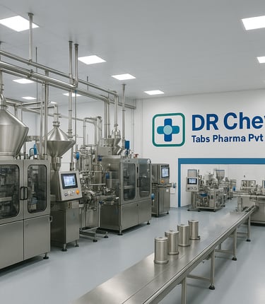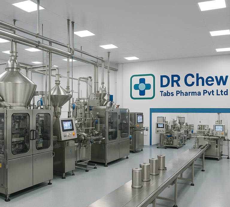 At Dr. Chew Tabs Pharma Pvt. Ltd., we combine scientific expertise with advanced technology to deliver premium-quality products tailored to our clients’ needs. Our state-of-the-art manufacturing facility is equipped with modern, fully automated systems and high-precision equipment, enabling us to maintain excellence across all stages — from granulation and tablet compression to blister packaging and bottle filling.