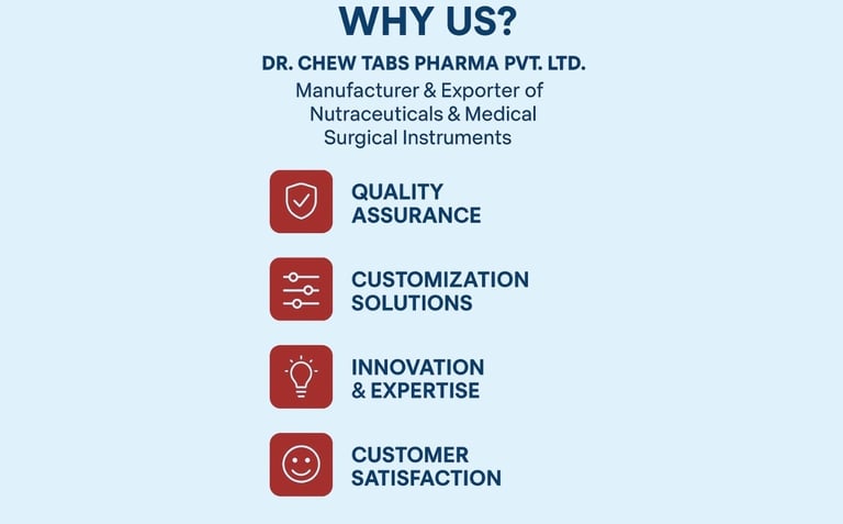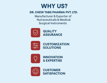 Dr. Chew Tabs Pharma Pvt. Ltd. is your one-stop solution for nutraceutical and medical-surgical manufacturing needs. From product development to packaging and global export, we handle it all under one roof. Partner with us for quality, innovation, and end-to-end brand support.